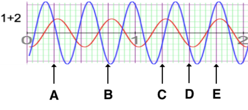 Wave 1 (in Red) and Wave 2 (in Blue) are moving through the same medium and undergoing interference. They have different wavelengths, frequencies, and amplitudes. For the five labeled points, categorize each as being locations where either constructive or descructive interference occurs.